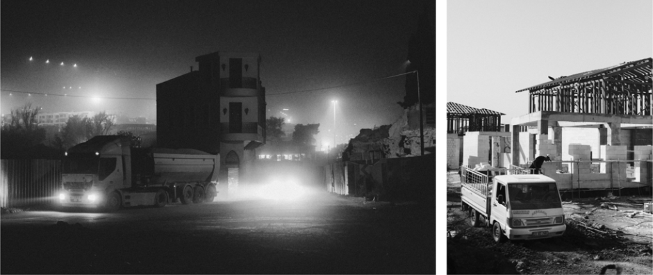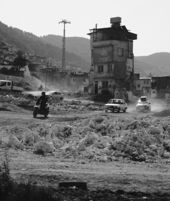 Entrer aujourd’hui dans Antakya revient à pénétrer dans un chantier de la taille d’une grande ville, où des grues pivotent dans toutes les directions à l’horizon. Des camps de conteneurs temporaires bordent la périphérie, tandis que de nouveaux immeubles d’habitation s’élèvent selon une répétition géométrique inquiétante sur d’anciens quartiers patrimoniaux ou sur des terrains restés jusqu’ici intacts.