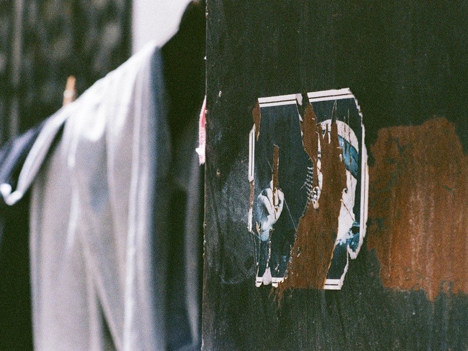 Affiche partiellement déchirée représentant un homme portant un keffieh palestinien noir et blanc. Amman, Jordanie. Crédits : Pierre Michaud